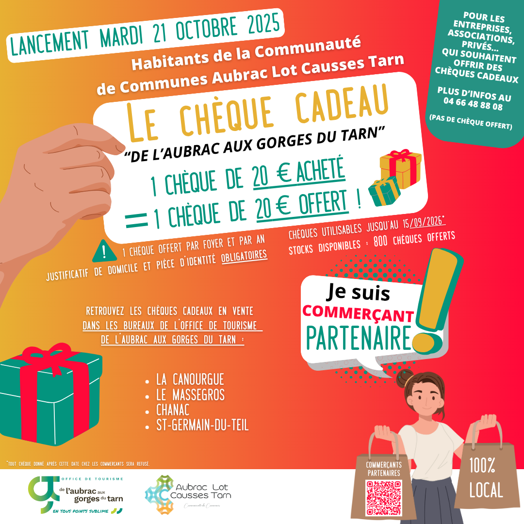 A destination des habitants de la Communauté de Communes Aubrac Lot Causses Tarn : rendez-vous dans l’un des bureaux de l’Office de Tourisme où, sous présentation d’un justificatif de domicile obligatoire, un chèque cadeau de 20€ acheté = un chèque cadeau offert de 20€ offert.